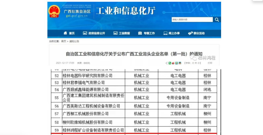 祝桂林鴻程礦山機(jī)械公司入選廣西工業(yè)龍頭企業(yè)!近日,自治區(qū)工業(yè)和信息化廳公布第一批廣西工業(yè)龍頭企業(yè)名單,共105家企業(yè)入選。其中,桂林鴻程礦山機(jī)械公司成為桂林21...